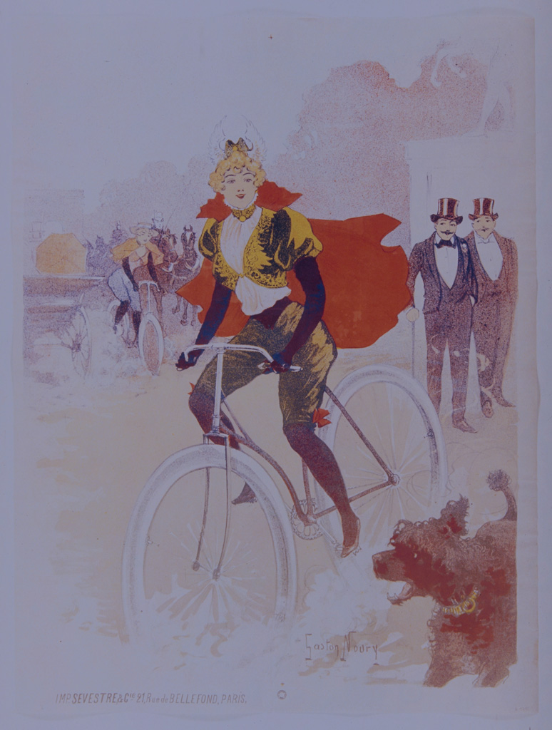 Bicyclette à cadre ouvert à tube courbe, fin du XIXe siècle. Dessin de Gaston Nourry, Paris : Imp Sevestre et Cie. Source : Médiathèque ville de Chaumont.