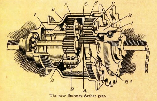 Schéma du moyeu à trois vitesses Sturmey-Archer, publié dans la revue Cycling, le 10 juin 1908. Source : http://www.sturmey-archerheritage.com.