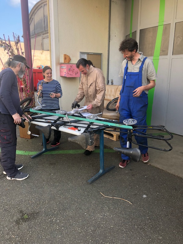 03 juin 2018. J – ??? avant le décollage. C’est l’effervescence à l’atelier de la Rue des Acacias. L’ambiance est fébrile, l’air chargé d’ozone, des jets d’étincelles jaillissent au-dessus de l’établi. Autour de l’étrange machine, pas moins de quatre bénévoles s’affairent. Il y a 50 ans, il s’agissait d’envoyer des astronautes sur la Lune. Aujourd’hui, il est question d’envoyer quatre cyclistes sur le chemin de halage en quadriplette. Le défi est de taille. La pression est énorme.