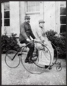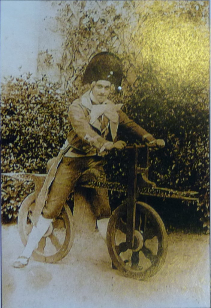 Camille Bollée sur sa draisienne vers 1910. Photo. archives Bollée, publiée dans Maine-Découvertes n° 13, Juin-Aout 1997, p. 34.