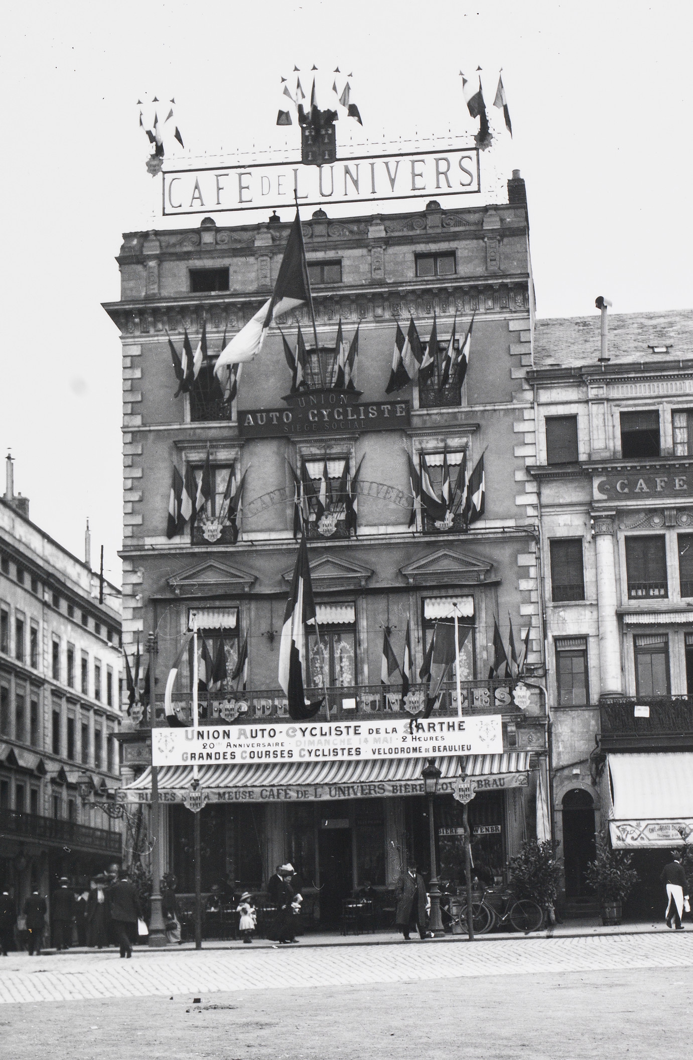Le Café de l’Univers, siège de l’U.A.C.S., pavoisé à l’occasion du 20e anniversaire de l’association. A.D. Sarthe : 23 Fi 1414.