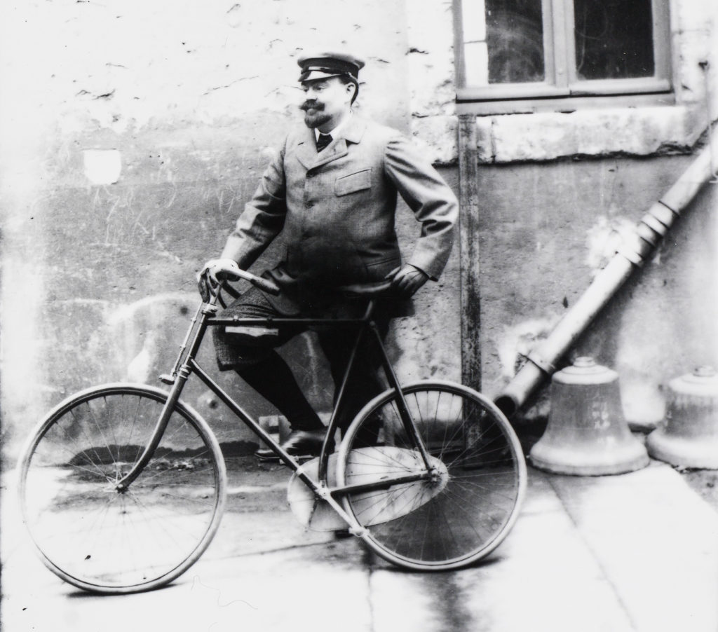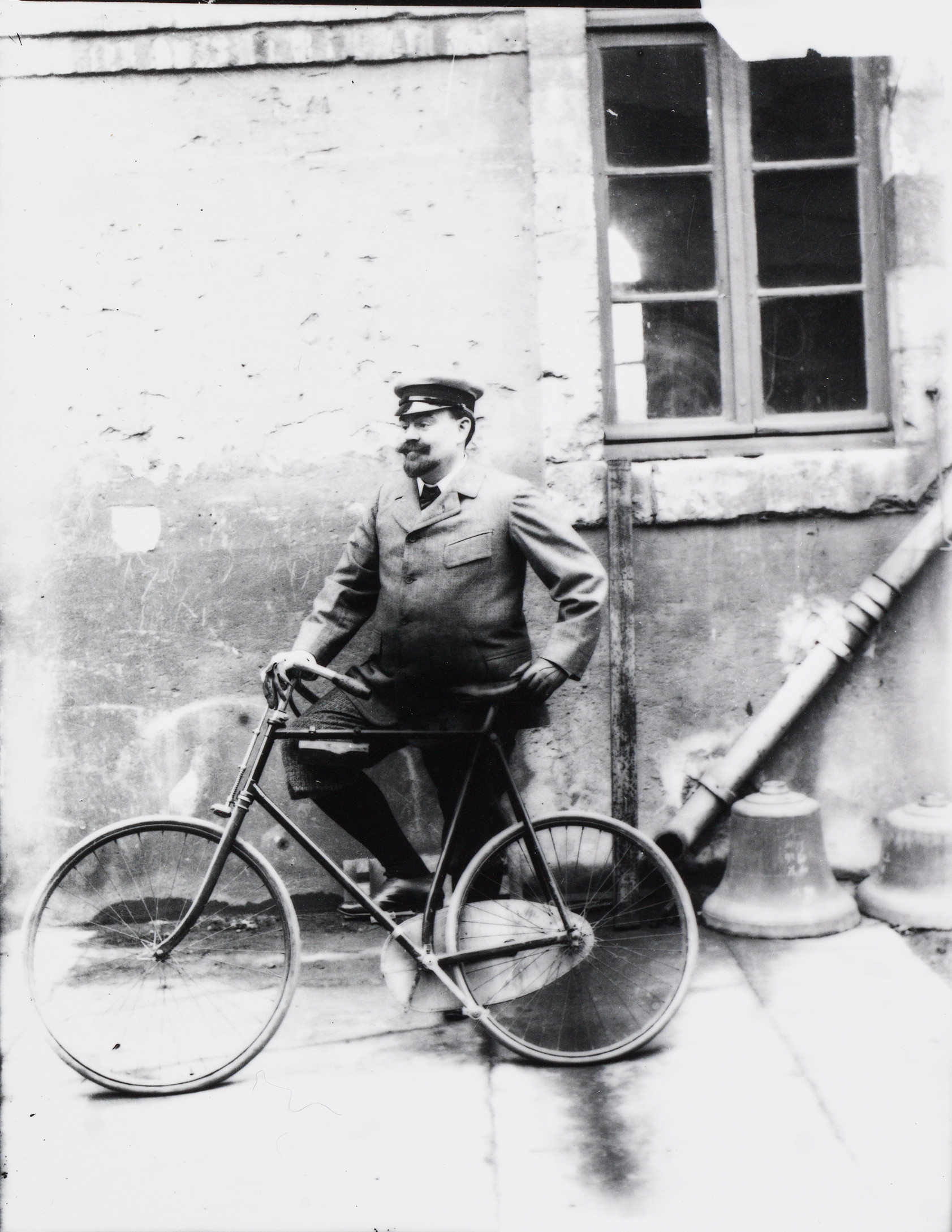 Léon Bollée et sa bicyclette vers 1892 dans la cour de la fonderie de cloches familiale.
