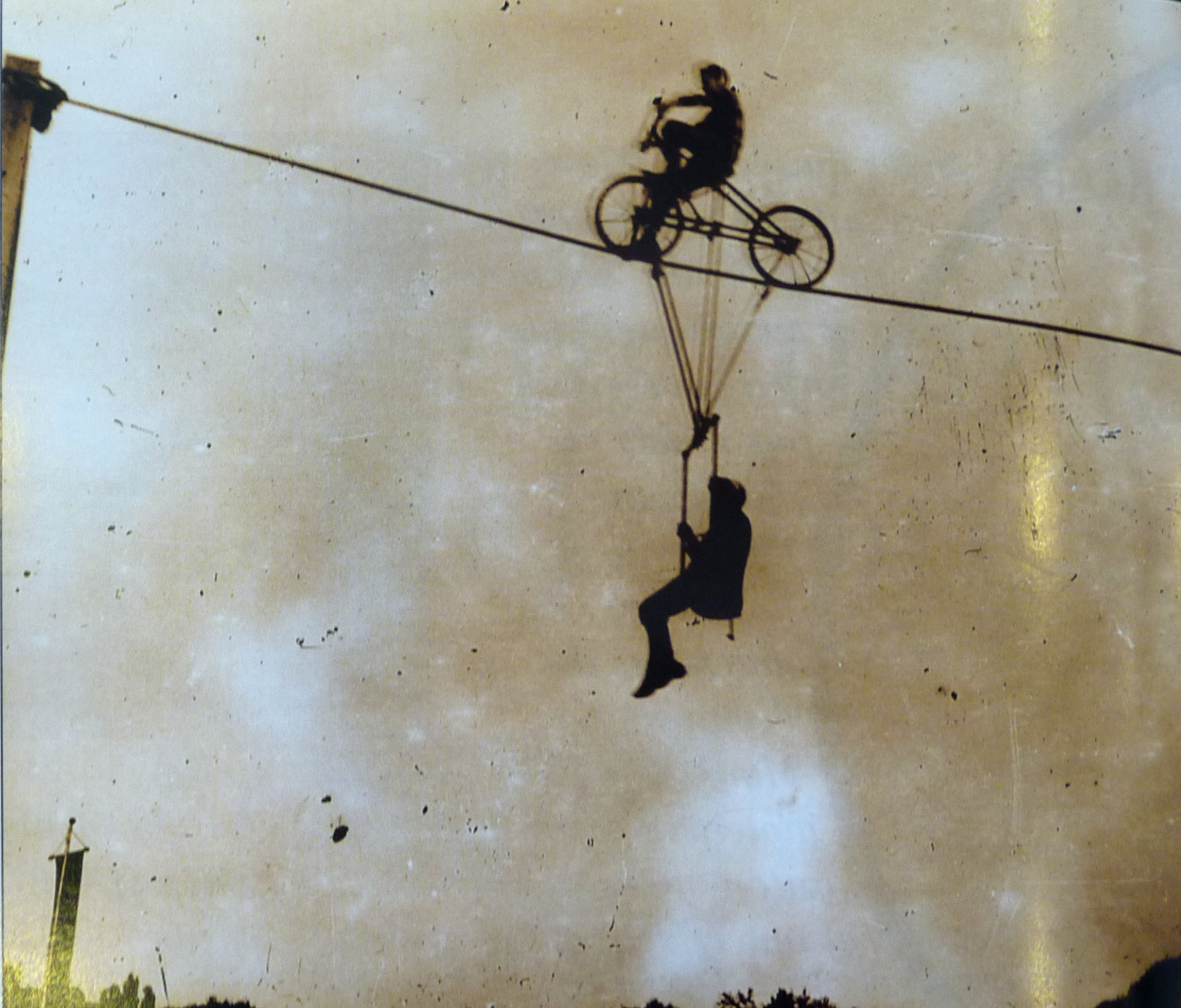 Plus drôles assurément furent les prestations de Léon lors des carrousels festifs organisés par l’U.V.S. Ainsi, lors de la première Grande Fête de la Reine bicyclette, organisée aux Jacobins en juillet 1892, Léon et Camille traversèrent la place à vélo… sur un câble de 50 m tendu à 10 m de hauteur ! Camille conduisait, Léon était assis dans un harnais suspendu à la bicyclette, et Amédée, sans doute passablement inquiet, avait calculé la résistance des câbles.