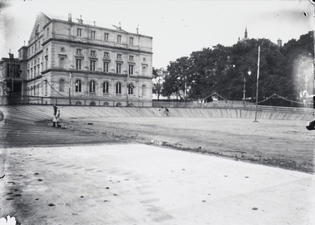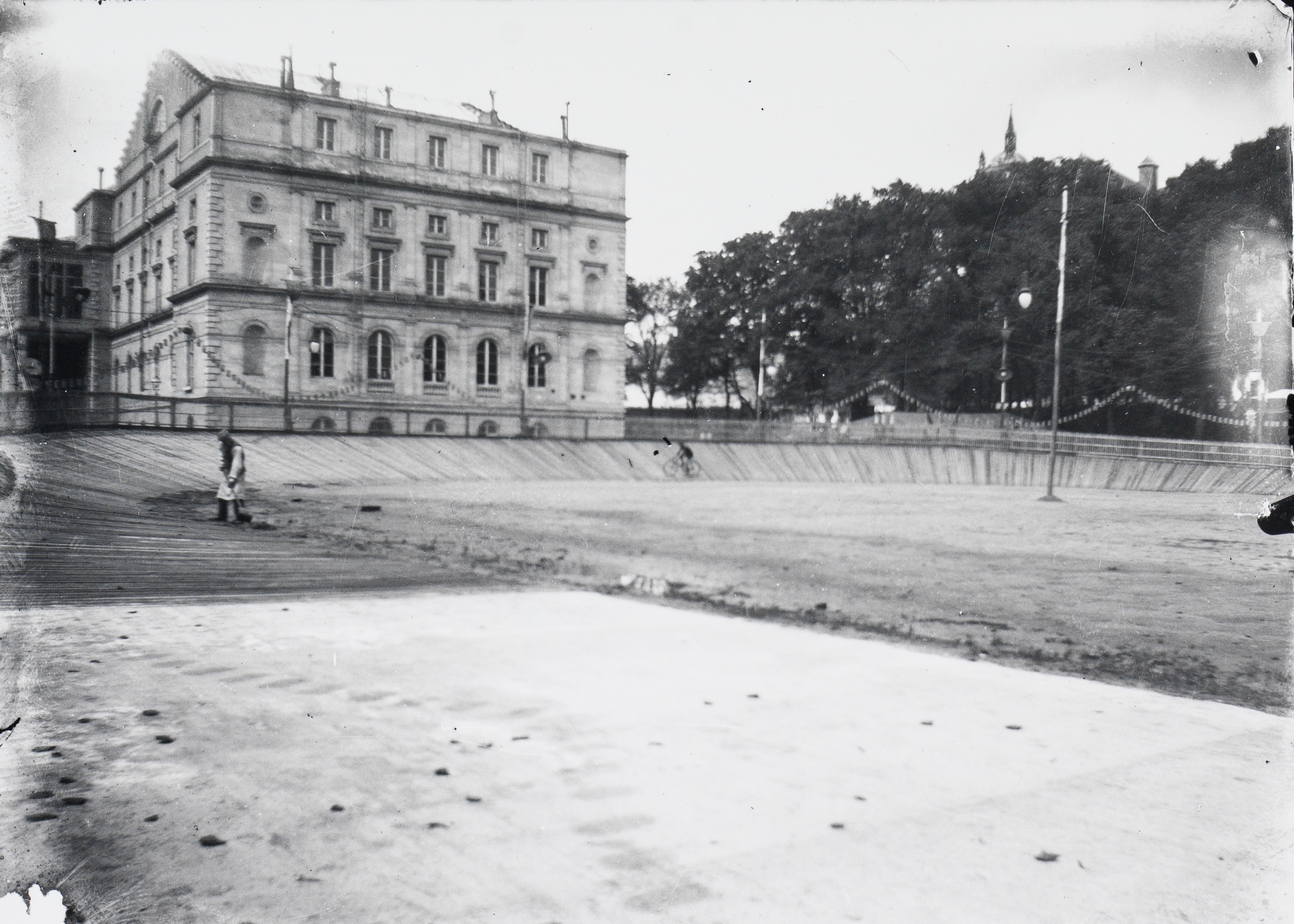 La piste du vélodrome provisoire du quinconce des jacobins, fin du XIXe siècle. Cliché G.Jagot, A.D. Sarthe : 23 Fi 1660.